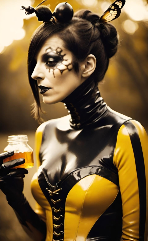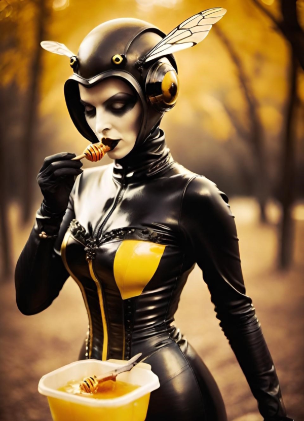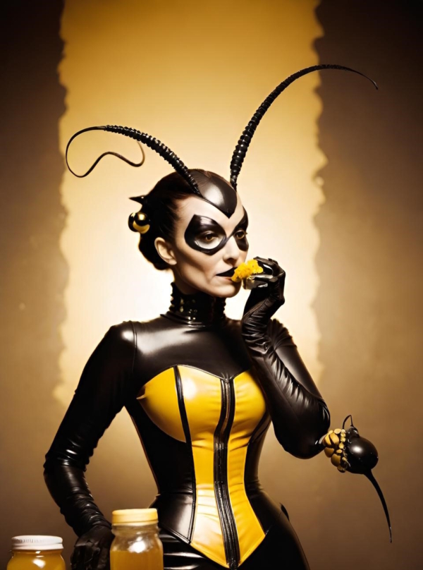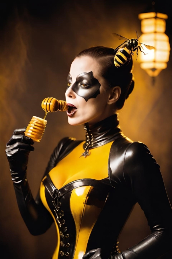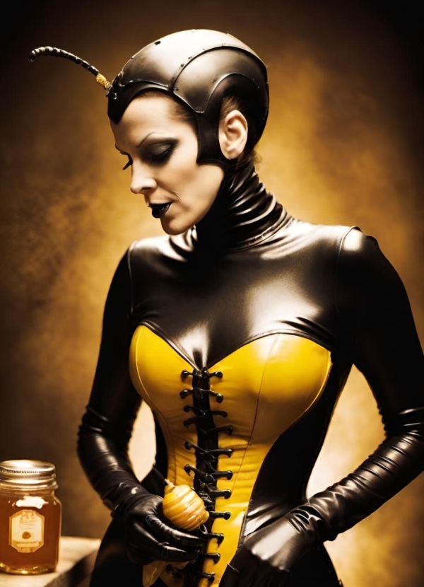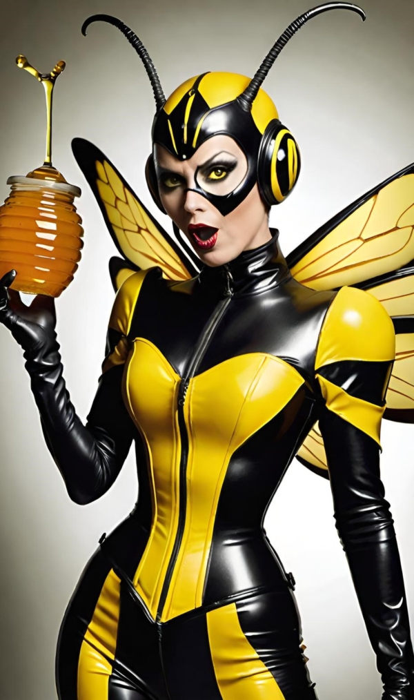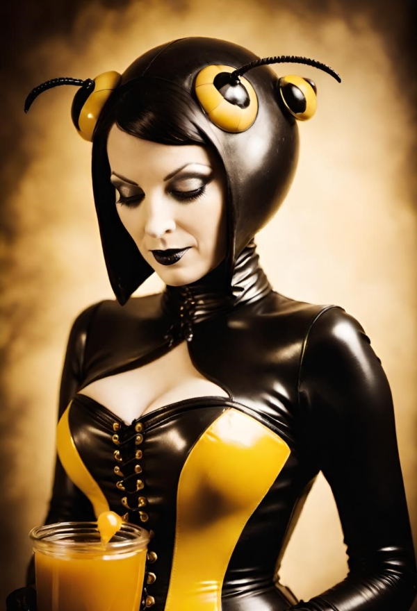 FetishPop! notes: “Royal jelly is 67% water, 12.5% protein, 11% simple sugars, 6% fatty acids and 3.5% 10-hydroxy-2-decenoic acid (10-HDA). Lady Wasp loves the fatty acids!”